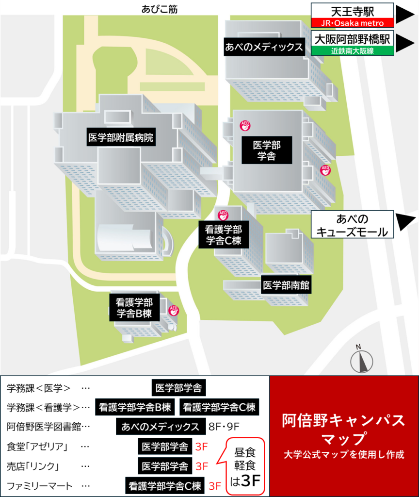 阿倍野キャンパスは、複数のビルで構成されたキャンパスとなっており、どこに何があるのか分かりにくいです。このマップでは、図書館や食堂、売店、ファミリーマート、学務課のある場所も併せて掲載しています。