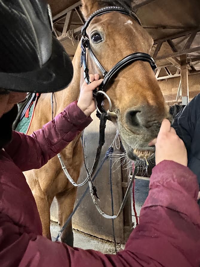 たまに馬とお散歩(曳き馬)もします。道中路肩に生えている草をつまみながら、15分くらいお散歩します。かわいい馬とほのぼのお散歩する時間は、部員に癒しを与えてくれます。