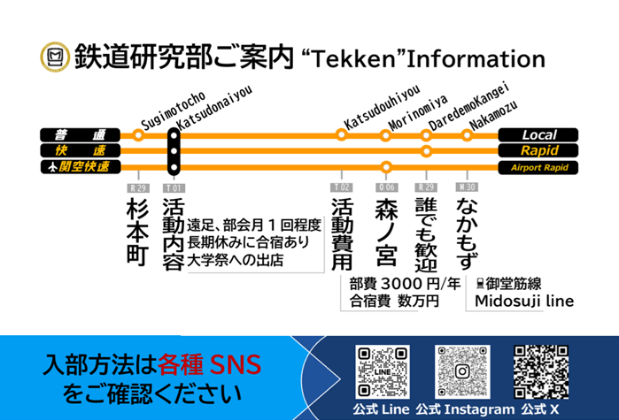 | 入部方法 | 各種SNSのDMや鉄道研究部のメールアドレス宛に、入部希望の旨をお知らせください。 確認でき次第、鉄道研究部より入部届を送信します。 入部予定者の入部届の送信が済み次第、入部となります。 |