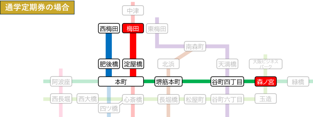 通学定期券の場合、谷町四丁目や本町など8駅が乗り降り自由に使えます。