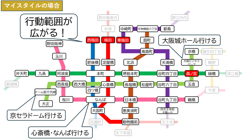 マイスタイルの場合、43駅(心斎橋駅・四ツ橋駅は繋がっているため1駅でカウント)が利用可能です。