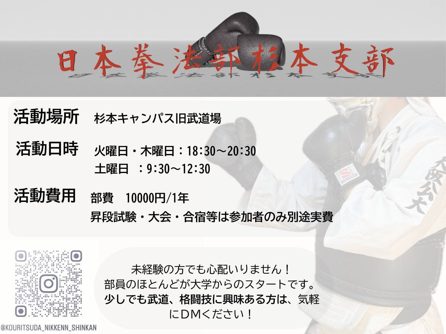 スポーツ系団体情報 #杉本#体育会#兼部・兼サー可能#2回生以上大歓迎 保護中: 日本拳法部杉本支部 防具をつけて行う安全な総合格闘技です!是非一緒に始めませんか? スポーツ系 2026.02.27 このコンテンツはパスワードで保護されています。閲覧するには以下にパスワードを入力してください。 パスワード: